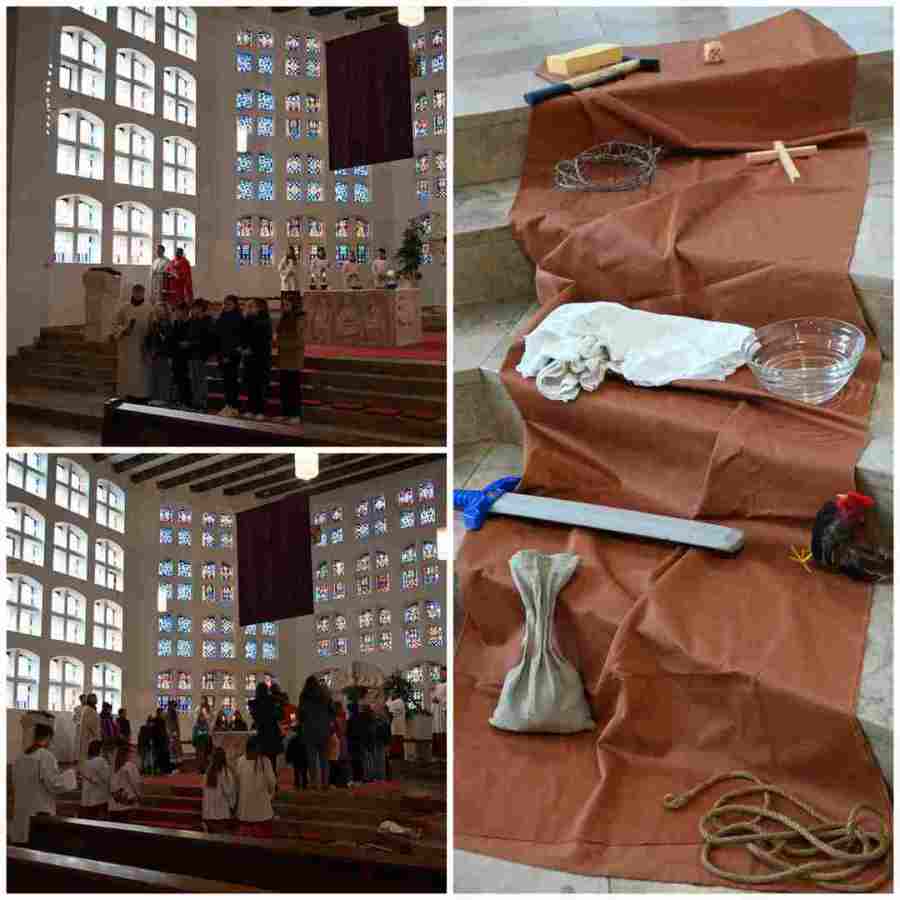 Im anschließenden Gottesdienst stand die Leidensgeschichte Jesu im Mittelpunkt. In diesem Jahr wurde sie im Familiengottesdienst auf besondere Weise gestaltet: Die Kinder trugen die einzelnen Abschnitte der Passionsgeschichte vor. Jeder Abschnitt wurde durch ein Symbol sichtbar gemacht. Diese Symbole legten die Kinder nach und nach neben der Marienstatue ab, sodass die Geschichte Schritt für Schritt auch bildlich erlebbar wurde.